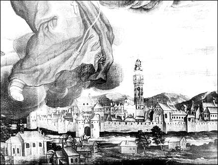 Panorama miasta od południa ze św. Paschalisem, fragment obrazu Bonifacego Jatkowskiego z 1715 roku.