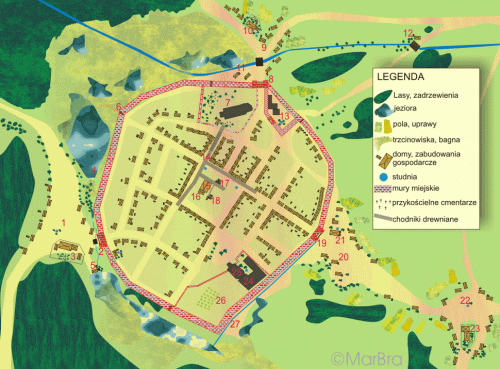 [1] Przedmieście Poznańskie za Bramą Poznańską [2] powstało na styku szlaków z Poznania oraz Bnina i Śremu. Wejście w obręb miasta ze szlaku poznańskiego przez dzisiejszą ulicę Kilińskiego był niemożliwy ze względu na istniejące od zachodniej strony miasta rozlewiska, i bagna [4]. Na przedmieściu istniał drewniany kościół pw. św. Ducha [3] wymieniany w 1411 roku. Stał do połowy XVIII wieku, chociaż istniejące przy nim cmentarz i szpital pełniły swe funkcje dłużej. Studnia w środku to już nasz pomysł, chociaż z reguły studnie istniały na rozstajnych drogach i w centrach osad. Naszą swobodną interpretacją jest też młyn wodny [5], który na przedmieściu poznańskim mógł korzystać z wód cieku płynącego od istniejącej na północnym-zachodzie rzeki Jeziornej - głównego cieku zasilającego system fosowy Środy. [6] W systemie murów miejskich istniały prócz bram także furty. Czy na przedłużeniu dzisiejszej ulicy Kilińskiego istniała takoważ? Wiemy z dokumentów o istnieniu furty kolegiackiej. Kolejną umieściliśmy na przedłużeniu 17 Września. [7] Kościół farny, później kolegiacki pw. Wniebowzięcia NMP lokacyjnego miasta. Na razie jest to świątynia drewniana. Dopiero za sto lat powstanie gotycka świątynia z fundacji Jagiełły istniejąca do dzisiaj. Wokół, średniowiecznym zwyczajem, istniał cmentarz. [8] Brama Gnieźnieńska, później zwana Bramą Wszystkich Świętych. [9] Przedmieście zwane początkowo Przedmieściem Góreckim, a później Przedmieściem Wszystkich Świętych (od wezwania drewnianego kościoła [10], który znajdował się tam już przed 1443 rokiem i istniał jeszcze po 1783 roku) lub Giełda. Przedmieście powstało za Bramą Gnieźnieńską. Być może jednak było tak, że Przedmieście Giełda to tylko niewielka terytorialnie, wykształcona z Przedmieścia Góreckiego część (plac targowy?), istniejące na południowy wschód od Przedmieścia Wszystkich Świętych, do którego początkowo mogła prowadzić furta po drugiej stronie zamku starościńskiego (w okolicach dzisiejszego wejścia do Biblioteki Miejskiej). Tuż za bramą płyneła rzeka (ciek) zwana Jeziorną [11], zasilająca miejską fosę i okoliczne rozlewiska. W miejscu przejścia szlaku istniał mostek. Stąd też Przedmieście Wszystkich Świętych zlokalizowane było w sporym oddaleniu od murów miejskich, w stosunku do innych przedmieść. Dom czarownicy obok mostku na Jeziornej [12] to oczywiście kwestia wyobraźni, pewne jednak jest to że to właśnie w sporym oddaleniu od miasta, mieszkali praktykujący magię, uzdrawianie i inni wyrzuceni poza nawias społeczeństwa. [13] W pobliżu murów i Bramy Gnieźnieńskiej istniał dodatkowo ufortyfikowany i wzmacniający system obronny miasta Zamek Starościński. [14] W znaczniejszych miastach, do których Środa z pewnością należała na szczególnie uczęszczanych szlakach i w miejscach reprezentacyjnych układano chodniki z bali drzewnych. Pamietać trzeba, że wobec braku jakiegokolwiek utwardzenia ulic i placów nawet lichy deszcz zamieniał miasto w grzęzawisko. Do tego dodać trzeba jeszcze powszechny w średniowieczu zwyczaj wylewania nieczystości wprost na ulicę. Czy w Środzie istniały takie drewniane pasaże? [15] Drewniany ratusz miejski istniał prawdopodobnie od początków lokacyjnego miasta. Jego rozbiórkę przeprowadzono w latach 1852-53, a nowym ratuszem od 1869 roku stał się budynek sądu powiatowego wybudowany na miejscu zamku starościńskiego. Pozostawiony z fundamentów dawnego ratusza kamień możemy dziś podziwiać w płycie rynku. [16] Obok ratusza stał niewielki budynek wagi miejskiej. [17] Po północnej stronie ratusza istniało 6 kramów piekarskich i szewskich. Rozebrano je w 1826r. [18] Po południowej stronie ratusza istniało 6 jatek rzeźnickich. Rozebrano je 1853r. [19] Brama Pyzdrska istniała na szlaku do Lądu i Nowego Miasta. Tuż za nią wykształciło się Przedmieście Pyzdrskie zwane także Pyzderskim [20]. W miejscu dzisiejszego charakterystycznego domu - dawnej karczmy umieścilismy jej pierwowzór [21]. Karczmy, zajazdy i poczty konne były nieodłacznymi elementami szlaków, stąd też ich obecność w pobliżu bram. Przedmieście to istniało od początku w ścisłym związku z przedlokacyjną osadą otwartą [22] istniejącą wokół kościoła [23] św Idziego, (okolice dzisiejszej poczty) już prawdopodobnie w XI w. Kościół spłonął doszczętnie w 1703r., a rozebrany został pod koniec XVIIII lub na początku XIX w. [24] klasztor dominikański wraz z kościołem pw. św Krzyża [25] powstał w pocz. XVw. i pełnił swe funkcje do końca XVIII wieku kiedy to uległ pożarowi. W 1815 roku klasztor sekularyzowano, choć w 1819 roku przebywało w nim dożywotnio jeszcze 4 mnichów. W 1823 kościół zamknięto, by sześć lat później przekazać go w użytkowanie gminie ewangelickiej. Dekadę później przebudowano nieznacznie kościół na dom modlitwy, szkołę i mieszkanie dla nauczycieli. Fatalny stan techniczny obiektu doprowadził do jego rozbiórki w 1886r. Już pięć lat wcześniej, z nieznacznie przesuniętą lokalizacją, powstał nowy kościół gminy ewangelickiej czyli obecny rzymsko-katolicki pw. Najświętszego Serca Jezusa. Teren dzisiejszego przedszkola zajmował z pewnością przyklasztorny ogród zawierajacy także sad, a może i winnicę [26]. Uprawa winorośli w średniowieczu w tej części Wielkopolski nie należała do rzadkości. [27] Od zachodniej i północnej części miasta istniał doskonale rozwiniety system wodny; bagien, stawów, oczek i trzcinowisk zasilanych ciekiem Jeziorna. Od strony południowej utworzono prawdopodobnie sztuczny kanał fosowy.