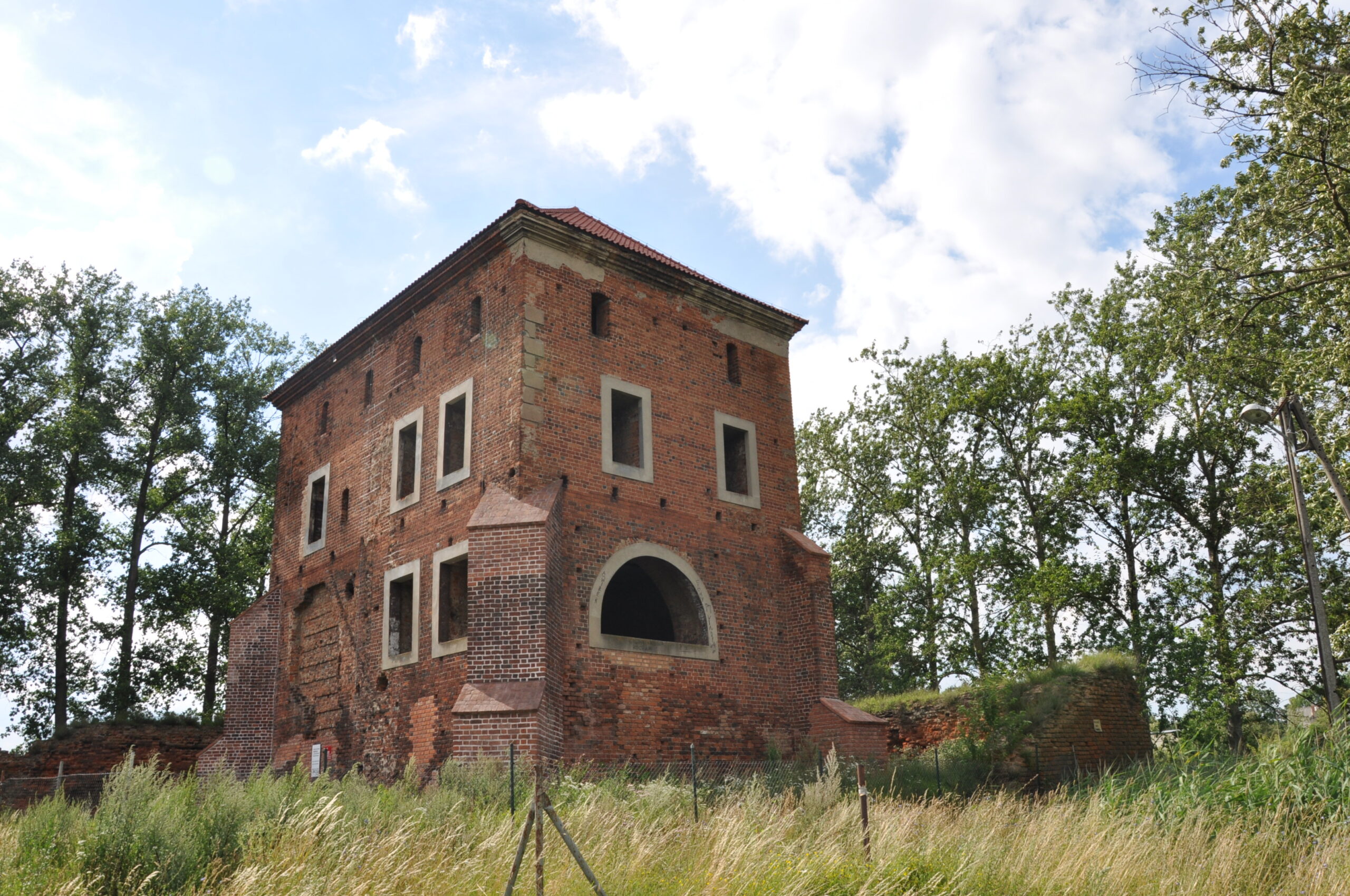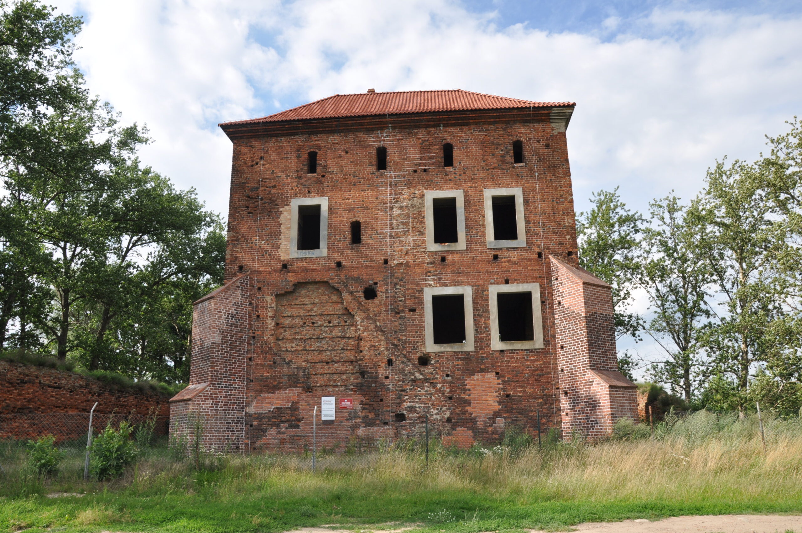 Którą odbudowę masz na myśli? Jeśli to współczesną, to na oko polegała na wypełnieniu niewielkich ubytków na koronie i licu murów oraz pęknięcia nad wejściem.
