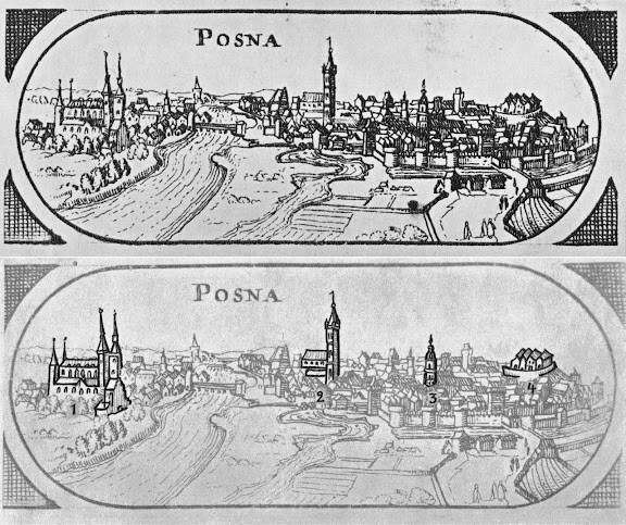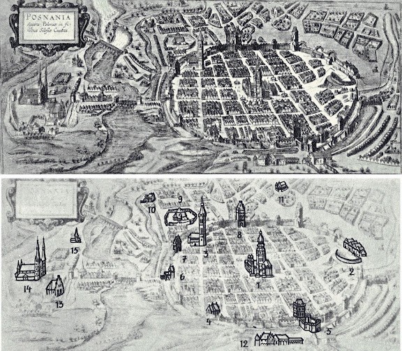 | 1618 Widok Ogólny od północy: 1. Ratusz, 2. zamek Przemysła, 3. kościół farny Św. Marii Magdaleny, 4. kościół Dominikanów, 5. brama Wroniecka, 6. brama Wielka, 7. brama Wodna, 8. brama Wrocławska, 9. kościół Bernardynów, 10. kościół Karmelitów Trzewiczkowsych (Bożego Ciała), 11. kościół Św. Marcina, 12. kościół i szpital Św. Ducha, 13. kościół Najświętrzej Marii Panny, 14. katedra, 15. kościół Św. Mikołaja na Zagórzu Autor Braun, Georg (& Hogenberg, Franz) Źródło "WIDOKI STAREGO POZNANIA" Magdalena Warkoczewska, Wydawnictwo Poznańskie, Poznań 1960 |