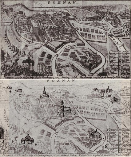 | 1704 Widok Ogólny od południa: 1. Ratusz, 2. Zamek Przemysła, 3. kościół farny Św. Marii Magdaleny, 4. kościół Jezuitów, 5. kościół Bernardynów, 6. kościół Karmelitów Trzewiczkowych (Bożego Ciała), 7. kościół Św. Krzyża, 8. kościół Św. Marcina, 9. kościół Św. Wojciecha, 10. katedra, 11. Akademia Lubrańskiego, 12. kościół NP Marii, 13. kościół Św. Mikołaja Autor Nieznany Źródło "WIDOKI STAREGO POZNANIA" Magdalena Warkoczewska, Wydawnictwo Poznańskie, Poznań 1960 |