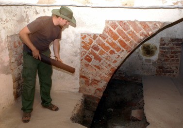 T. Olszacki prezentuje doskonale zachowane w murach młyna gotyckie gurty sklepienne odsłonięte spod tynków.