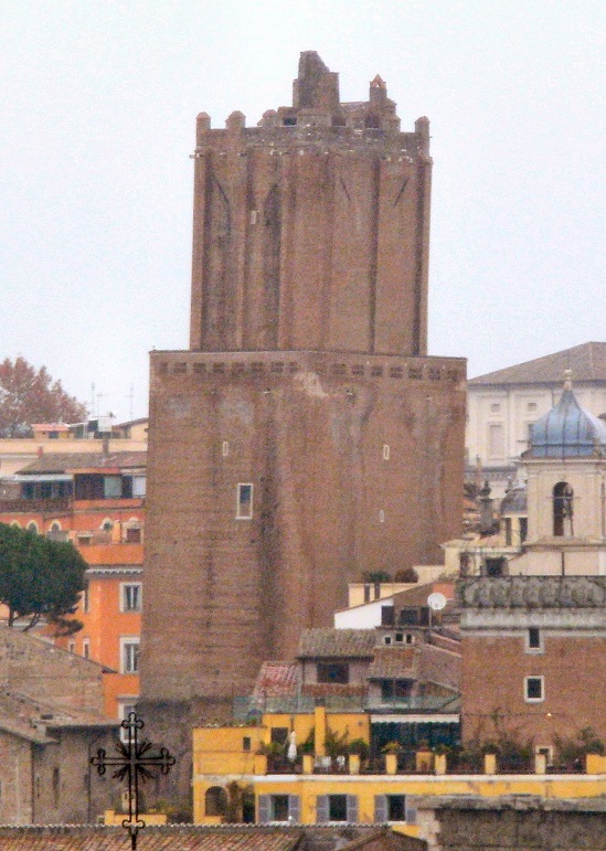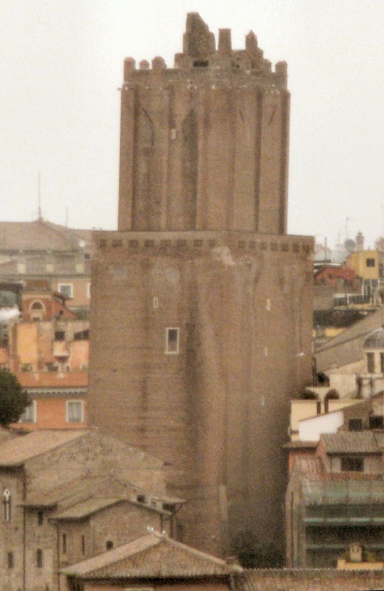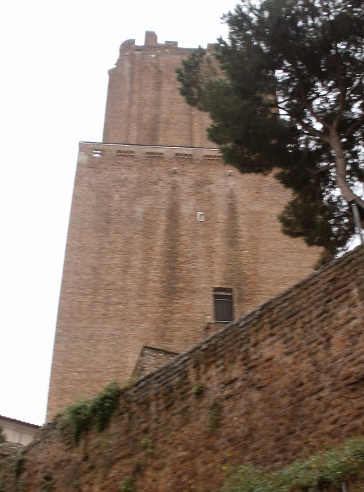 Na pierwszym planie mur Subury (zbudowany przez cesarza Augusta jako zapora oddzielająca jego wspaniałe forum od dzielnicy biedoty), na drugim planie - Torre del Grillo, a na trzecim potężna Torre delle Milizie. Widok z Palatynu.