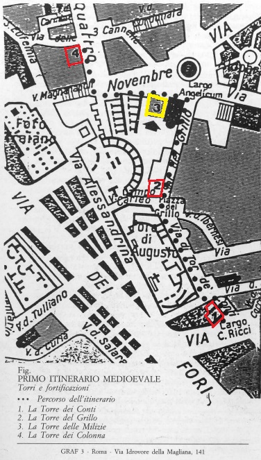 Położenie Torre delle Milizie (nr 3 - żółta), poniżej Torre del Grillo (nr 2), na dole Torre dei Conti (nr 1) i u góry Torre dei Colonna (nr 4). W środku Hale Targowe Trajana. Plan z ulotki "La Torre dlle Milizie" SPQR Assesorato alla Cultura Sovrintendenza Comunale. Anna Maria Cusanno. https://www.sovraintendenzaroma.it/sites/default/files/storage/original/application/b305c3e2a14113ca4f8969bf93918919.pdf