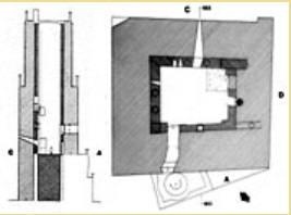 Plan i przekrój Torre delle Milizie. Ciemniejszym kolorem zaznaczone mury pierwszej wieży kamienno-ceglanej z 1 poł. XIII w. Jaśniejszy kolor - ceglane mury rozbudowy wieży z 2 poł. XIII w.