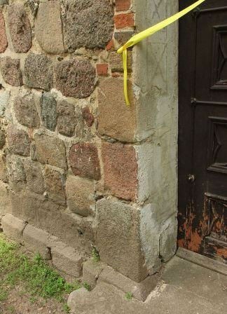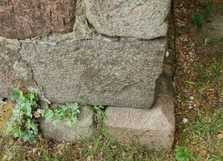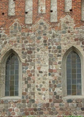 Z pierwotnego detalu zachował się ostrołukowy portal zachodni, dolna część portalu południowego (wtórnie przekształconego) oraz gzyms podokapowy. Z otworów okiennych zachowała się zamurowana i częściowo uszkodzona triada okien w ścianie wschodniej i dwa również zamurowane okna w ścianie południowej, z czego jedno jest praktycznie niewidoczne, bo zasłania je bluszcz. W ścianie północnej okien nie było. (fot. czerwiec 2013)