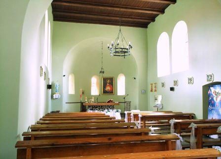 Wewnątrz zachowany łuk tęczowy łączący wnętrze nawy z prezbiterium oraz koncha apsydy. Ponieważ trwały przygotowania do ślubu udało się wejść. (fot. czerwiec 2013)
