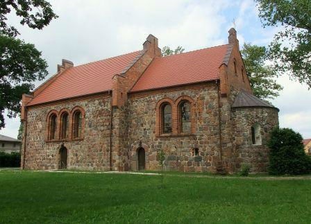 Romański, zbudowany w 2 ćw. XIII wieku (przed 1242) składał się z prostokątnej nawy oraz wyodrębnionego węższego prostokątnego prezbiterium zakończonego apsydą. Jako budulca użyto równo ułożonych warstw kwadr granitowych, o różnym stopniu obróbki, łączonych zaprawą wapienną.