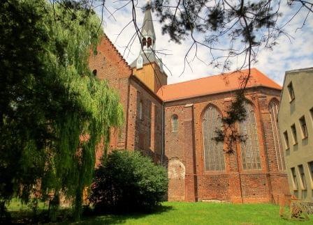 Romański, budowany w 1-2 ćw. XIII wieku (po 1210 roku) z cegły układzie wendyjskim, 3-nawowy z transeptem, parami kaplic bliźniaczych i prezbiterium zamkniętym półkolistą apsydą. Z pierwotnego założenia zachowało przęsło zachodnie prezbiterium, transept z przylegającymi dwoma kaplicami północnymi oraz dwa przęsła wschodnie nawy głównej.