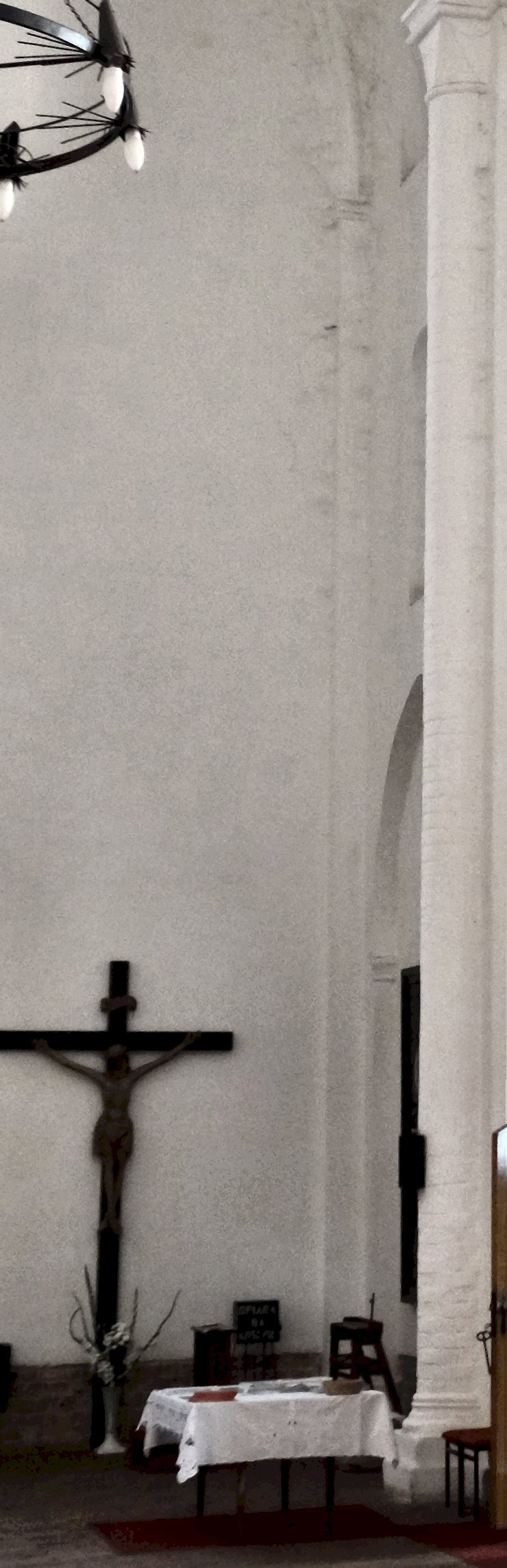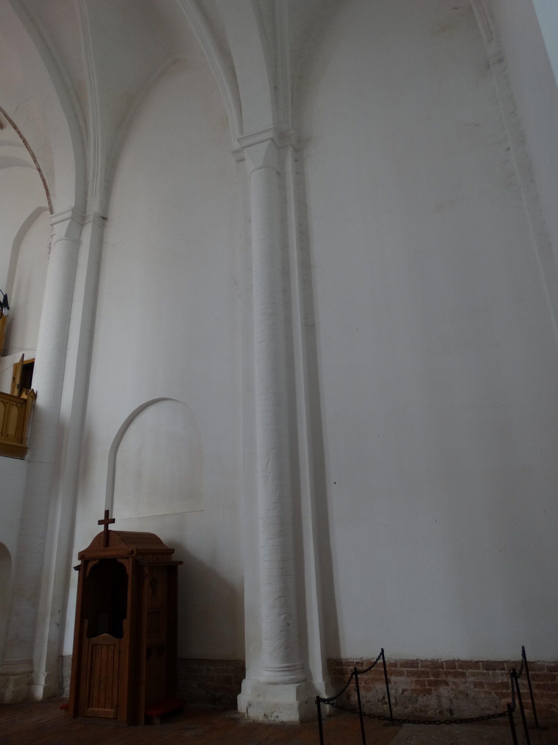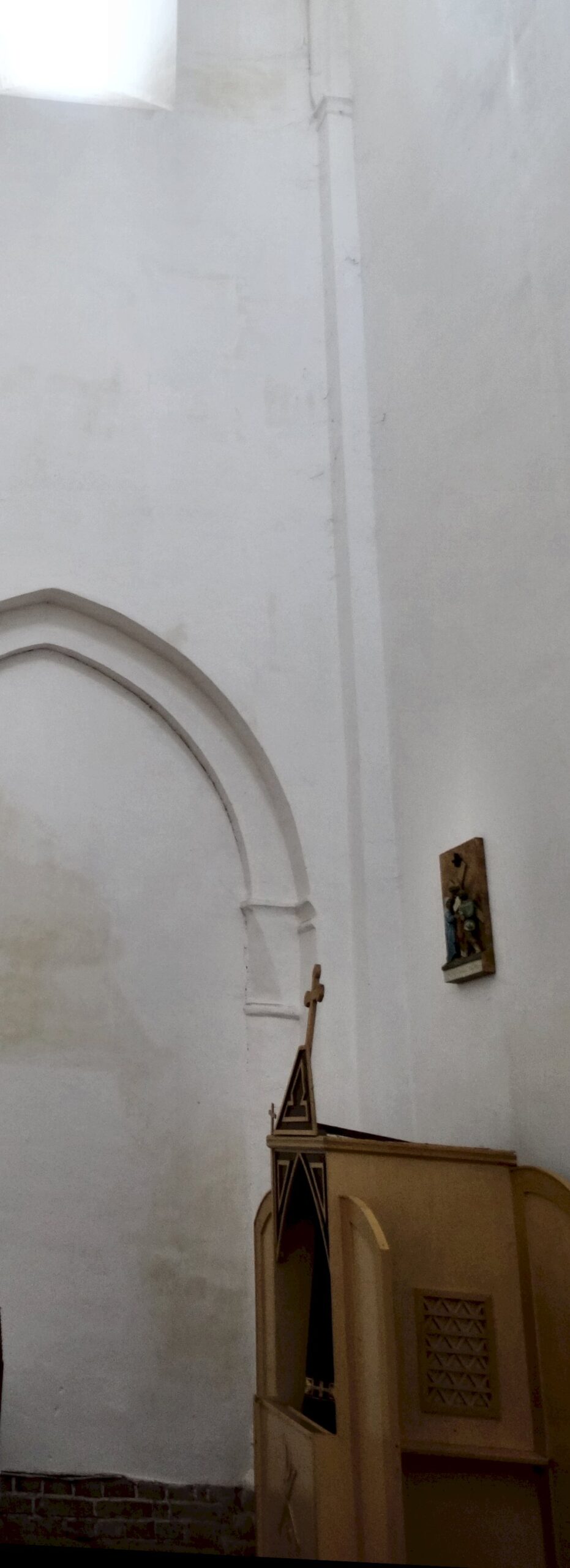 Zamurowane arkady międzynawowe (po lewej fragment arkady nawy bocznej na jej wylocie do transeptu - 8b)
