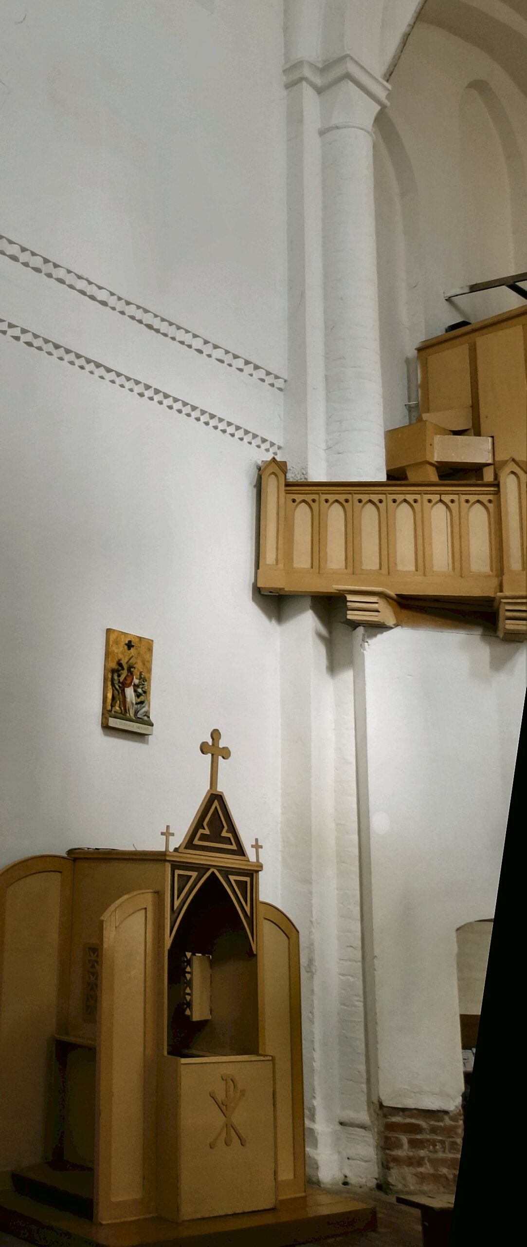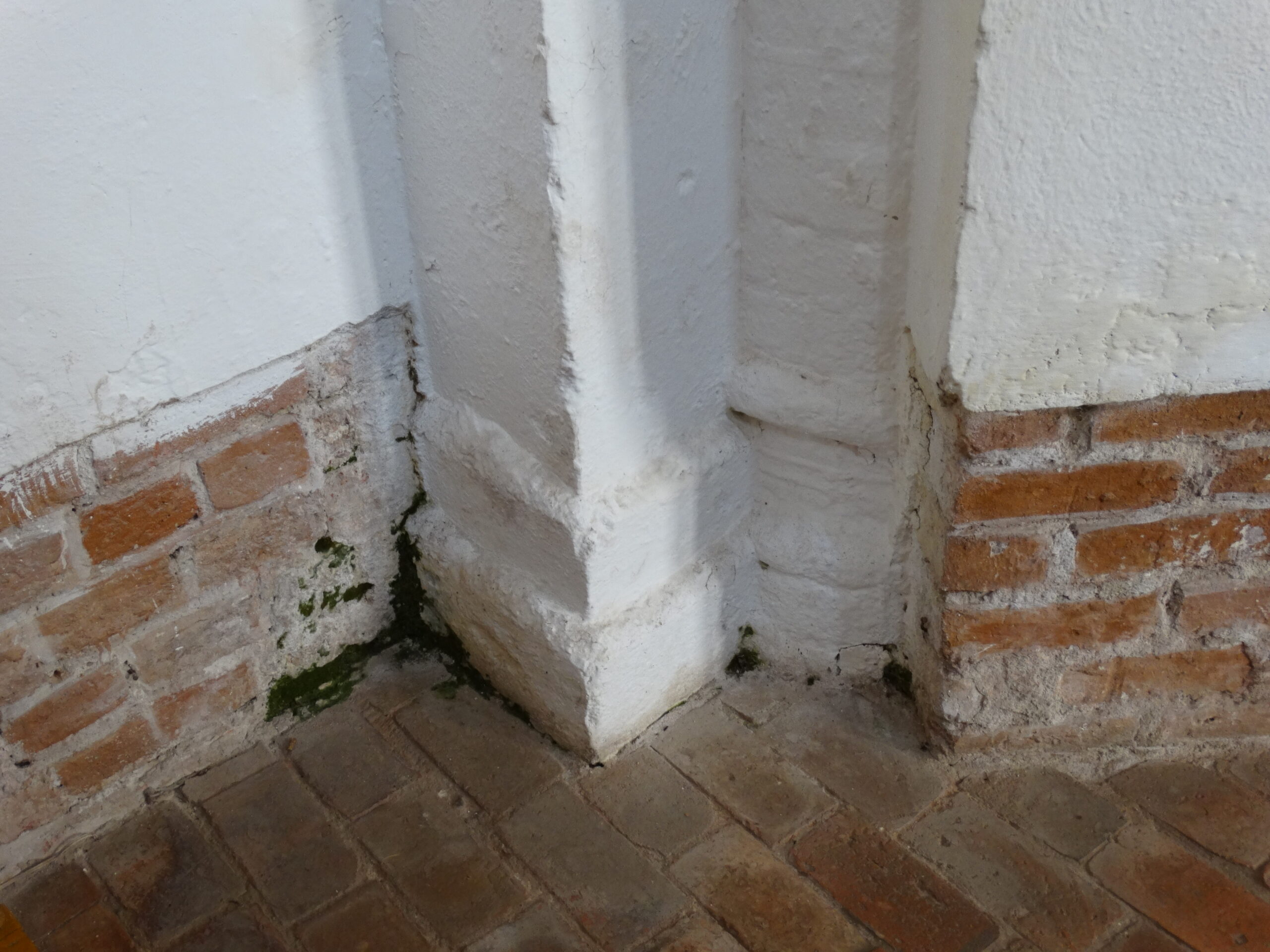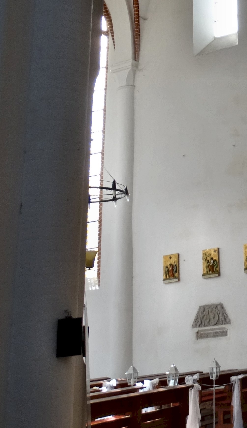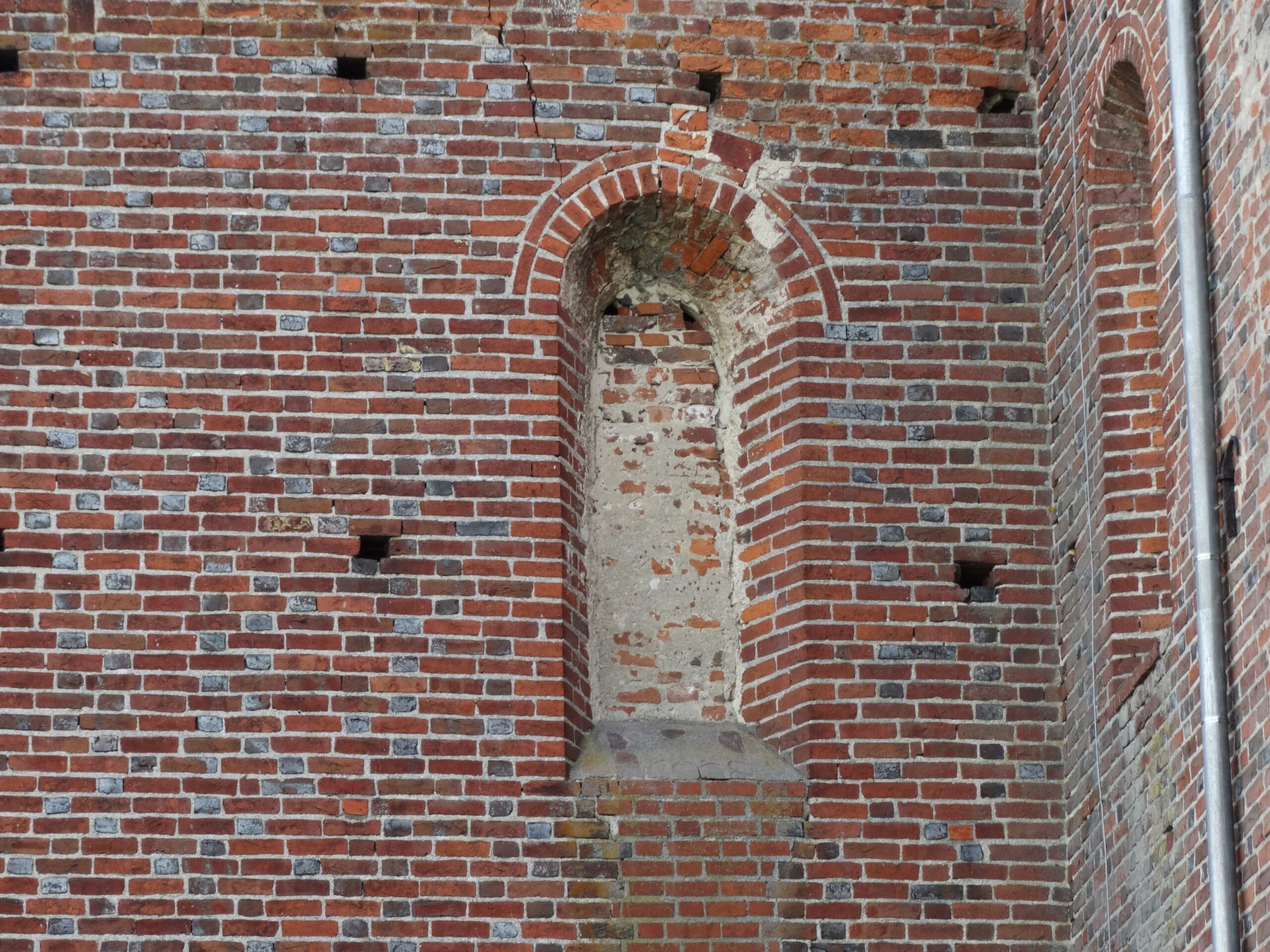 Zamurowane arkady międzynawowe (po lewej fragment arkady nawy bocznej na jej wylocie do transeptu - 8b)