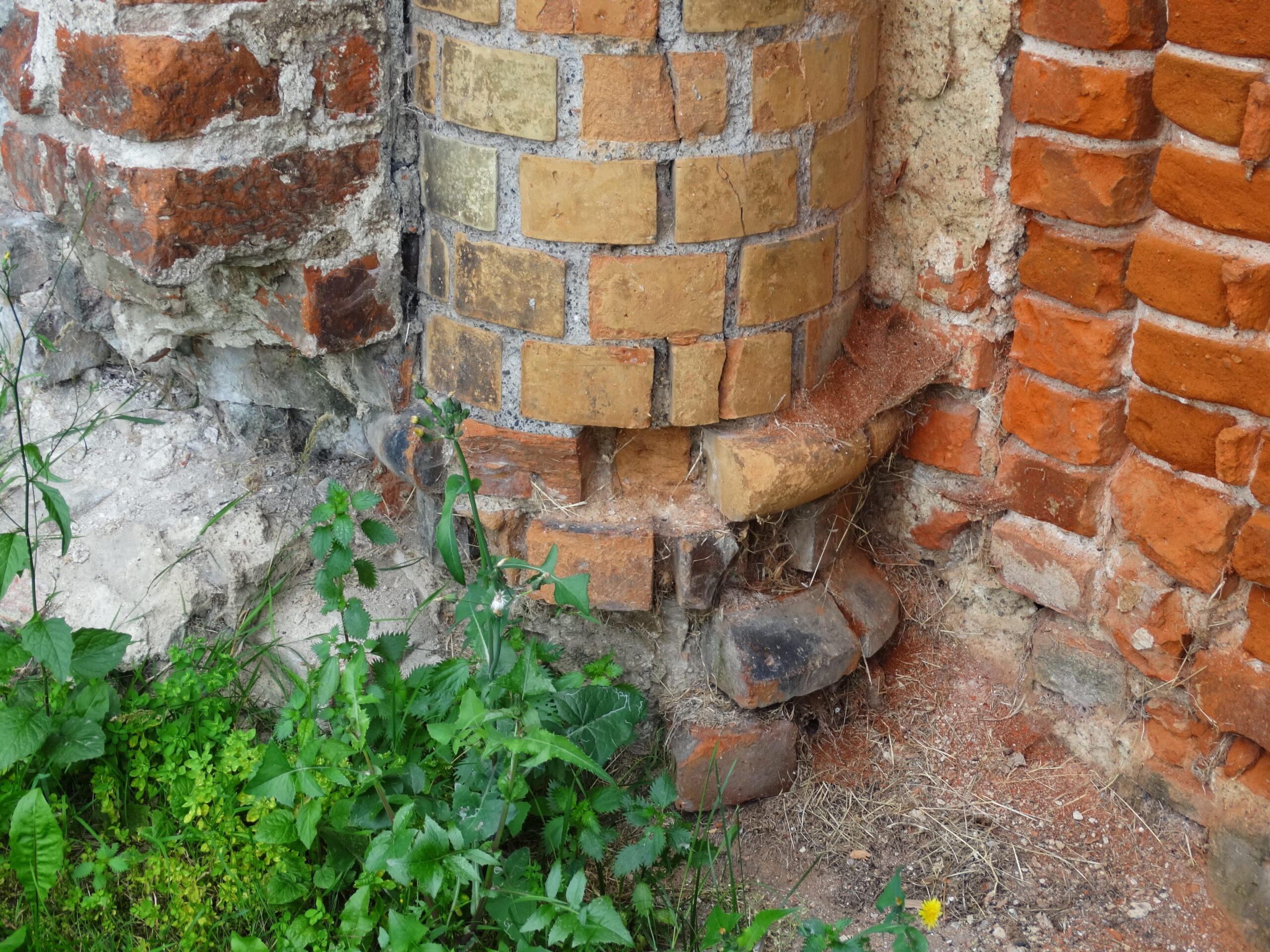 - uszkodzona wschodnia (lewa) część fryzów i przyziemnych partii arkad i półkolumn (zwłaszcza wschodniej), uszkodzenia półkolumn w arkadzie wschodniej w związku z licznymi przeróbkami zamurowania i kreacja wtórnych otworów