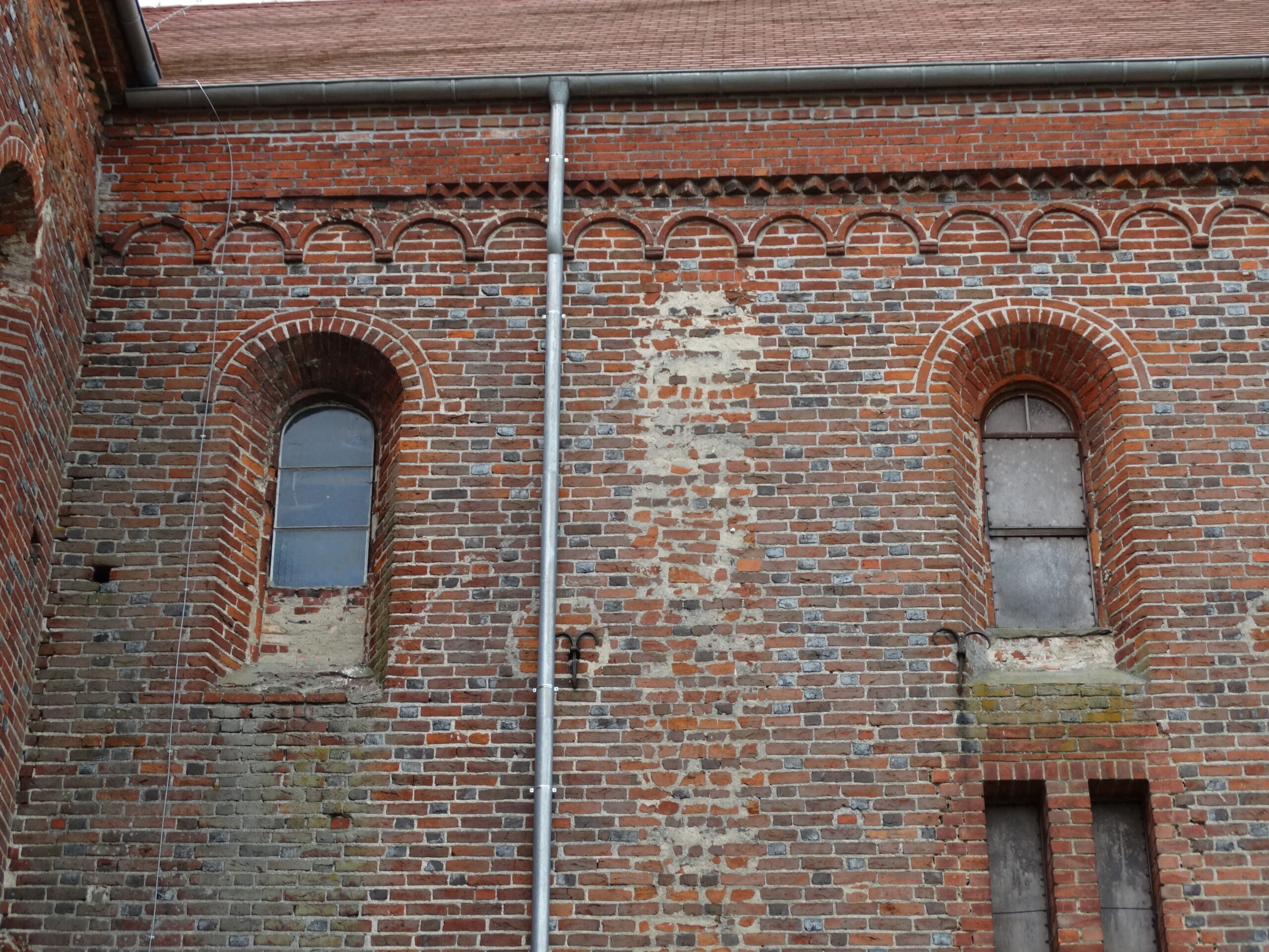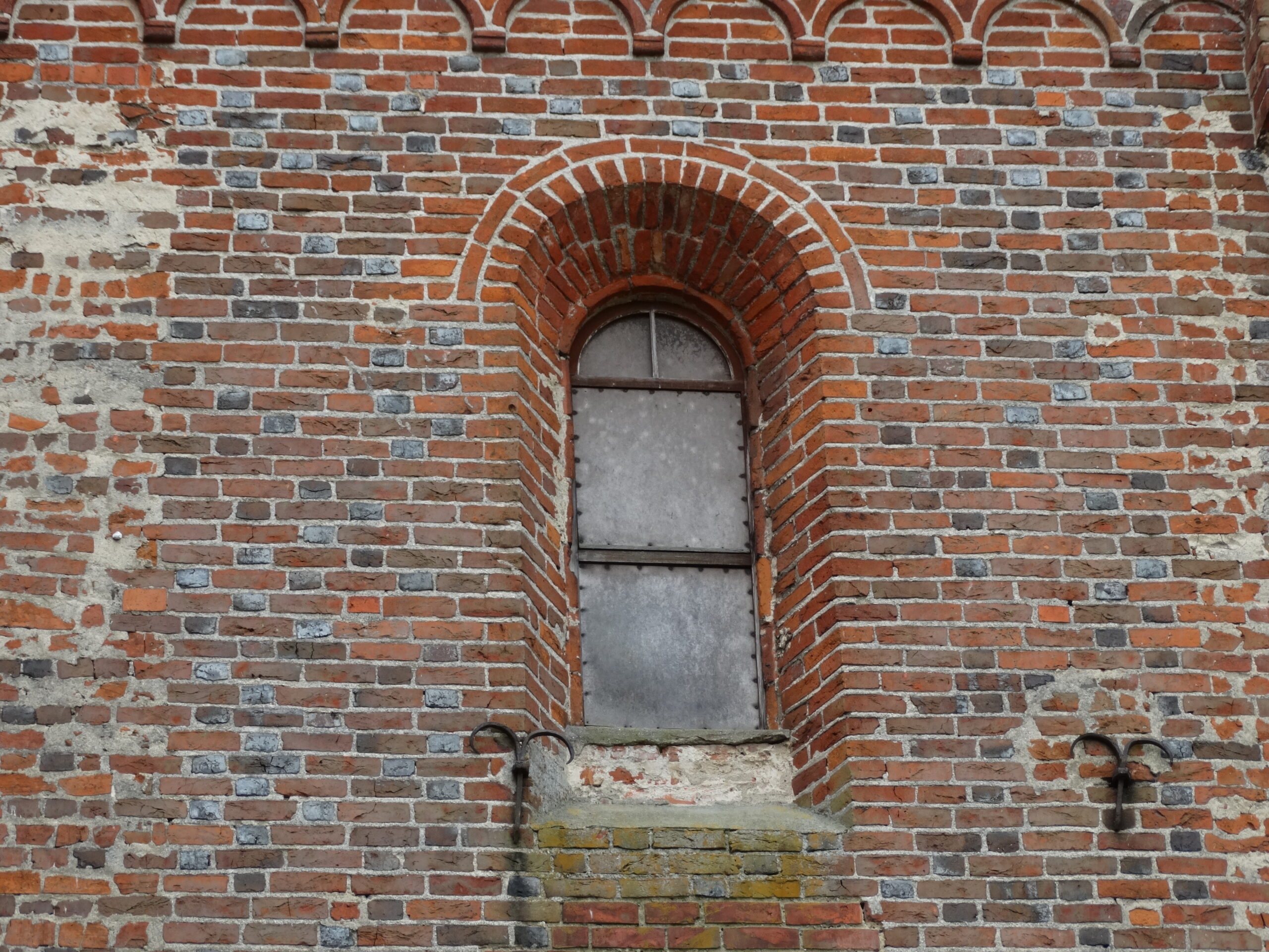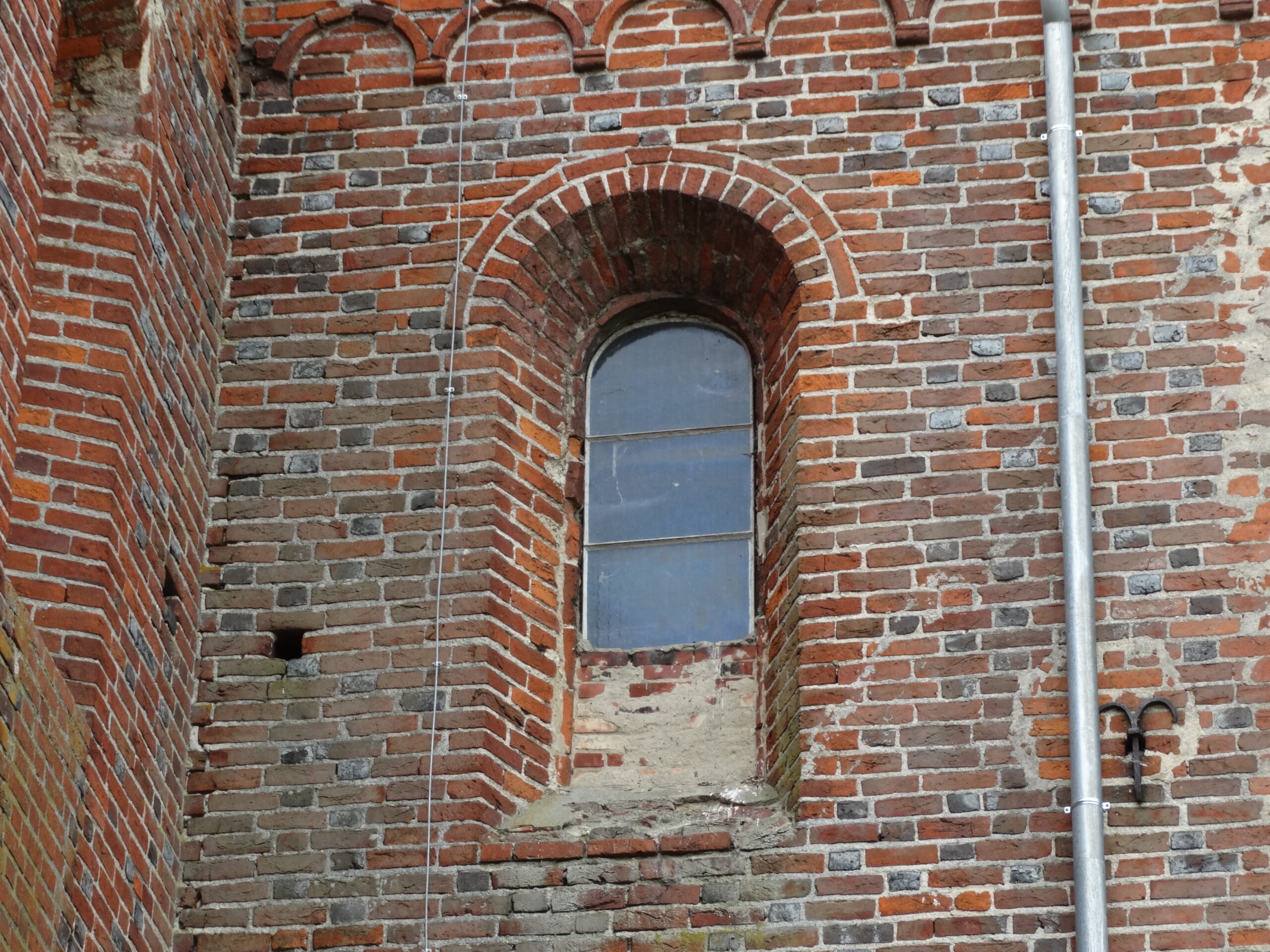 Autentyczne, romańskie okna (od dołu lekko zamurowane) i fryz arkadkowy. Poniżej prawego okna romańskiego dwa wtórne, prostokątne okienka spichrzowe z okresu międzywojennego