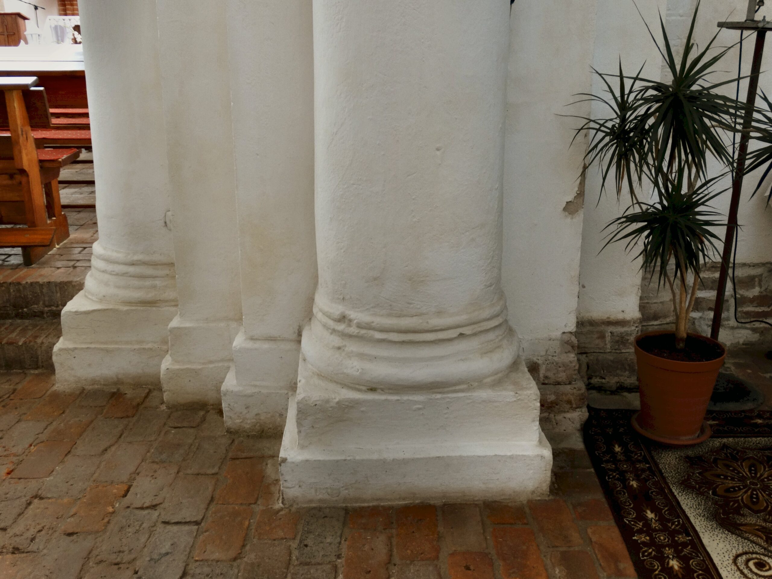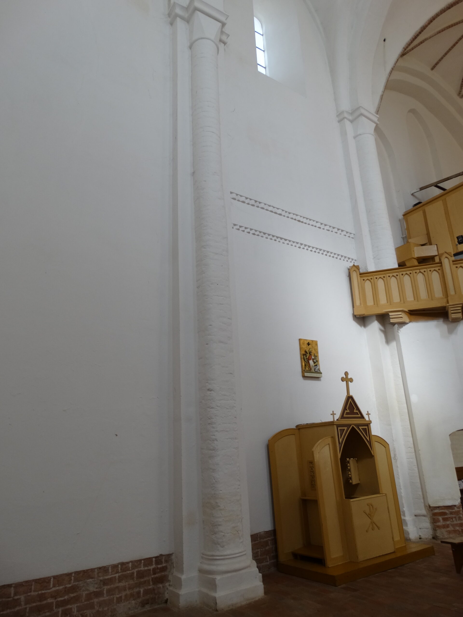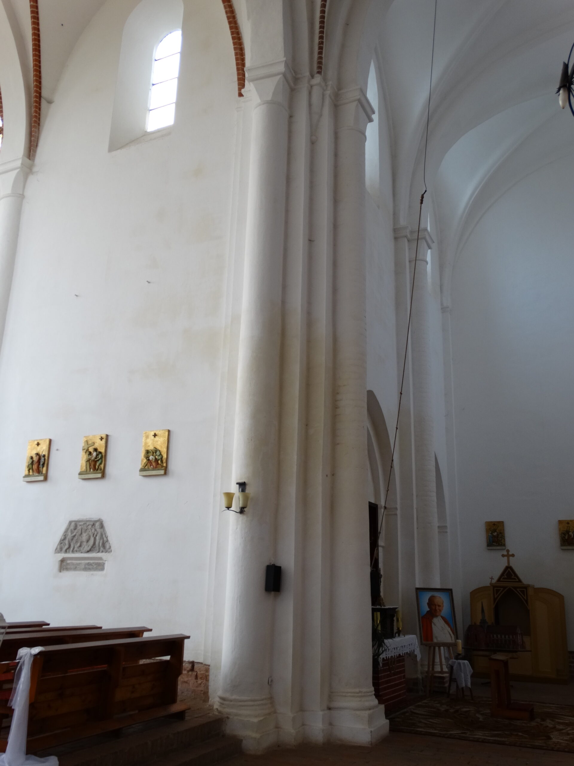 Wschodnia para półfilarów (1, 2) zachowana jest w oryginale, każdy zaopatrzony w dwie półkolumny o trapezowatych głowicach i profilowanych bazach. Para zachodnia jest uszkodzona prze wtórną ścianę zamykającą nawę kościoła przekstałconą w XVI w. na spichlerz - widoczne są tylko półkolumny od strony transeptu.