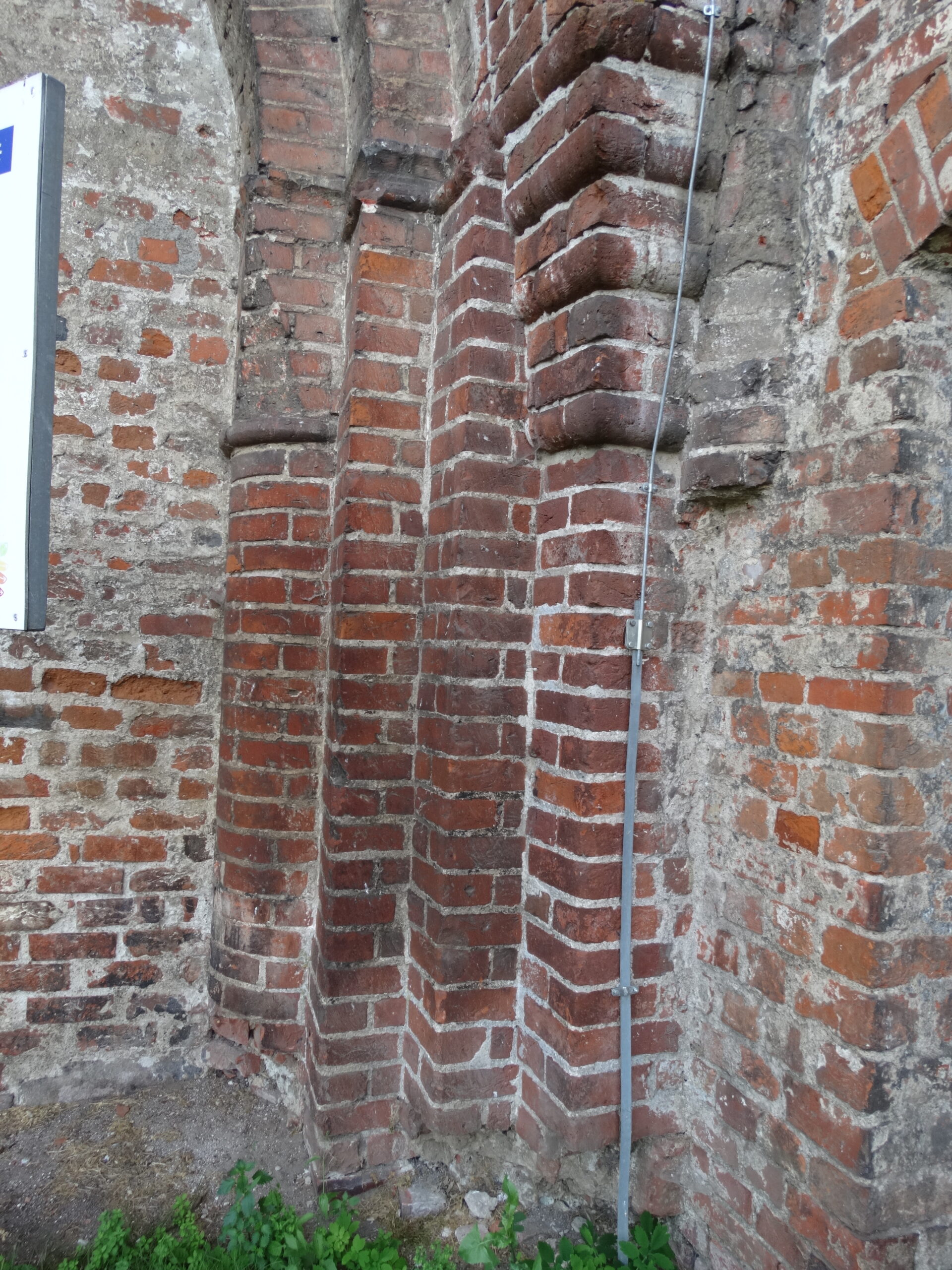 - "...Fryzy obu opisanych typów [z arkadek prostych i przeplecionych - mój dop.] uzupełniane były często wąskimi pasami ukośnie ustawianej cegły, tj. tzw. „fryzem ząbkowym”, „zębatym” lub też „fryzem z cegieł ustawianych rąbem skośnym”, wyznaczającym linie odgraniczające pas dekoracyjnej kompozycji fryzu od pozostałej płaszczyzny muru..."