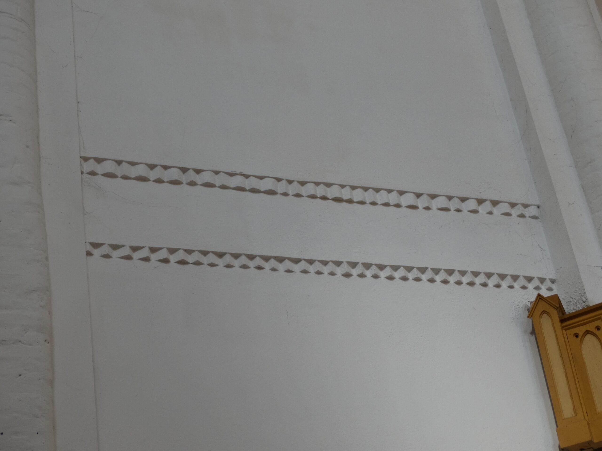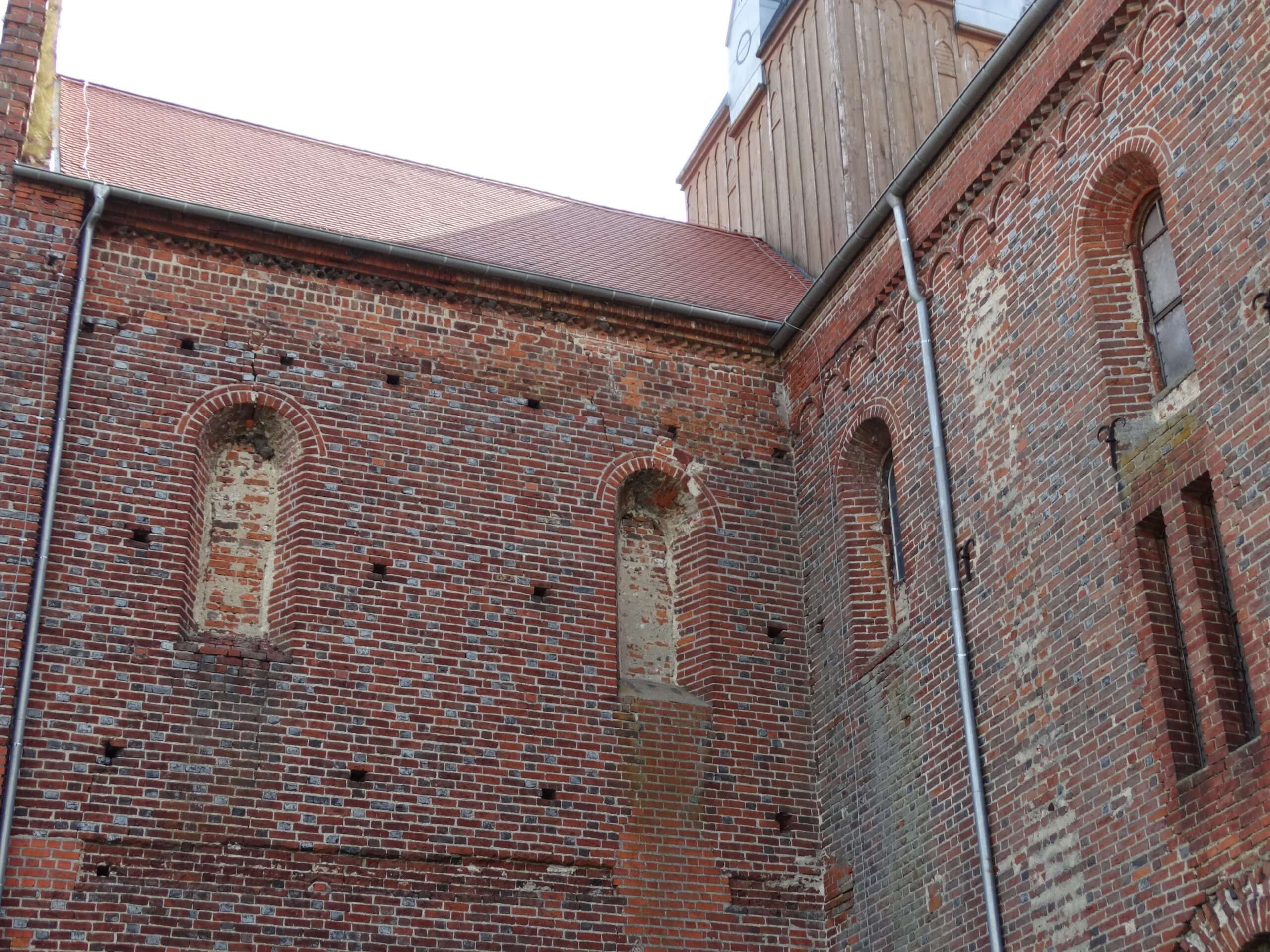 - wszystkie 3 typy późnoromańskie były "z zasady" - czego dowodzi autor ww. opracowania - pierwotnie tynkowane i to zawsze w ten sam sposób: fryzy przeplecione: wnętrza "dolnych arkadek ostrołucznych" - cienka warstwa pobiały, wnętrza "górnych łuków pełnych" - grubym białym tynkiem na równo z powierzchnią arkadek (dawało to zróżnicowany efekt plastyczny w obrębie tynkowanych arkadek), łuki pozostawały czerwone; fryzy zębate: co druga "ukośna" cegła bielona, co druga naturalnie czerwona lub malowana na wiśniowo; fryzy kratownicowe: wnętrza pól kratownicy bielone, ramy naturalnie czerwone