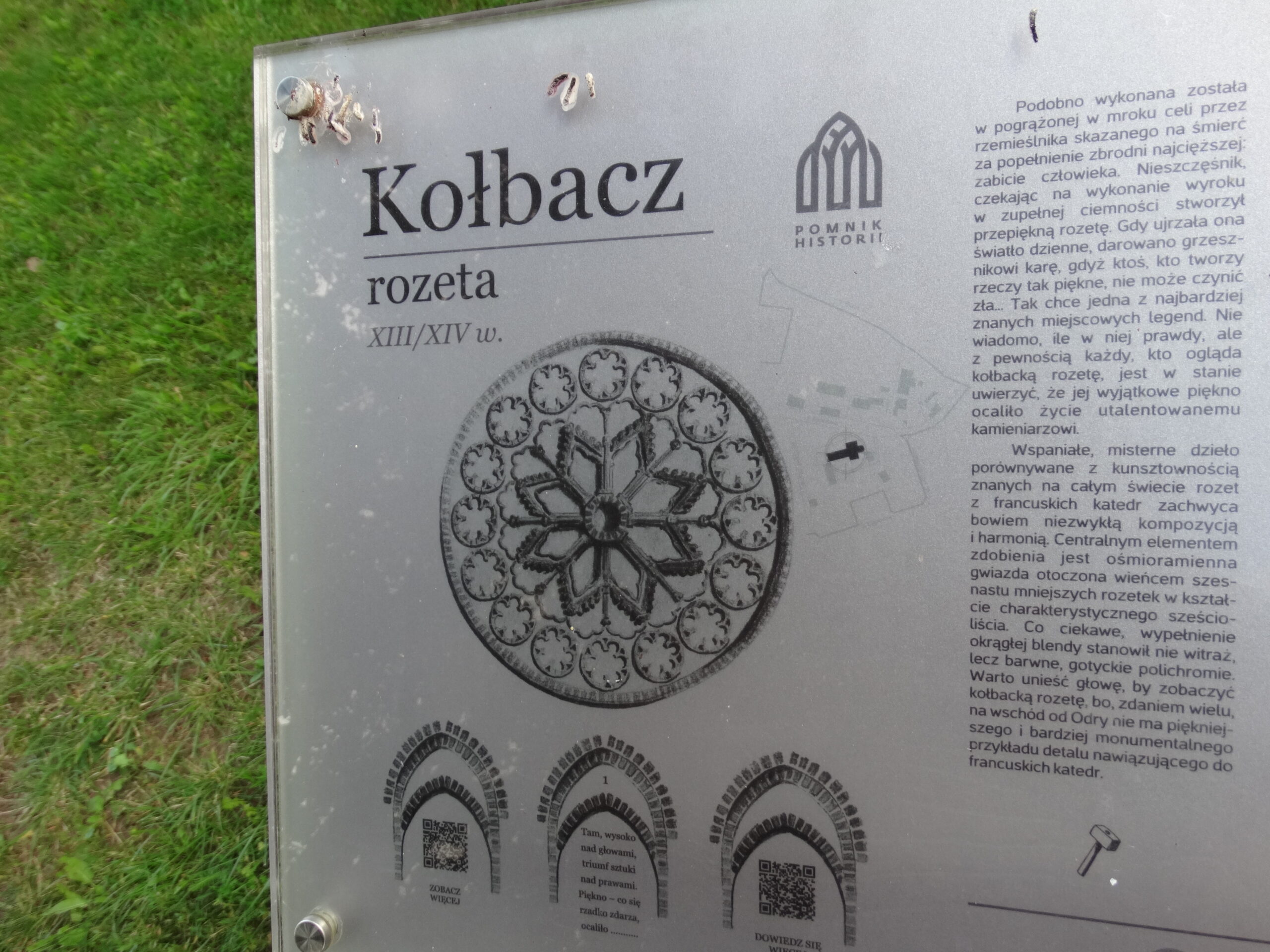 Warto wspomnieć o wczesnogotyckiej rozecie w formie blendy na zachodnim szczycie kościoła (XIII/XIV w.), która jest dumą Kołbacza i jednym z najwybitniejszych dzieł tego typu w Polsce (porównywanym z rozetami katedr francuskich). Choć powstała w epoce gotyku, swą stylistyką nawiązuje jeszcze do form romańskich...