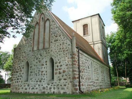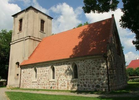 Zbudowany w 4 ćw. XIII wieku (ok. 1286) na planie prostokąta, bez wieży i prezbiterium. Obecna wieża pochodzi z XVII wieku. Elewacje ścian wymurowane są z w miarę regularnie ułożonych warstw kwadr granitowych o niewielkim tylko stopniu obróbki i o różnej wielkości.
