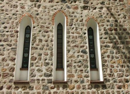 Z pierwotnego detalu zachował się zamurowany ostrołukowy portal północny, a z otworów okiennych triada okien w ścianie wschodniej oraz po jednym oknie w bocznych elewacjach nawy. Okna pierwotnie posiadały ościeża zamknięte półkoliście, później zastąpione ceglanymi ostrołukowymi. (fot. czerwiec 2013)