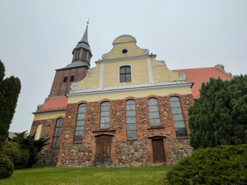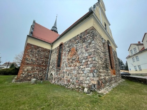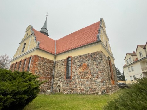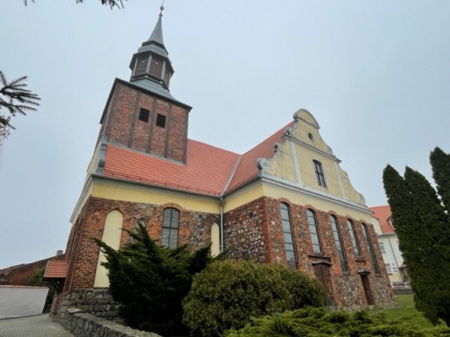 Świątynia została wzniesiona w końcu XIII wieku z kostki granitowej i cegły. w XV wieku została przebudowana w stylu gotyckim. W latach 1290-1537 patronat nad kościołem sprawowały miejscowe cysterki, następnie ród von Waldowów. W 1 ćwierci XVIII wieku, po zniszczeniu przez pożar, budowla została ponownie przebudowana: nadano jej kształt krzyża greckiego i wzniesiono cztery barokowe szczyty. W 1729 roku została wzniesiona szachulcowa wieża z hełmem nad częścią zachodnią i zostało przebudowane wnętrze. Kościół poświęcony jako rzymskokatolicki w dniu 8 września 1946 roku przez księdza Franciszka Łojka. W 2004 roku świątynia otrzymała sprowadzone z Włoch relikwie św. Franciszka z Asyżu.