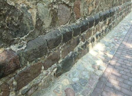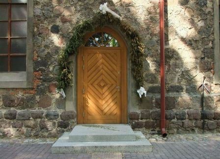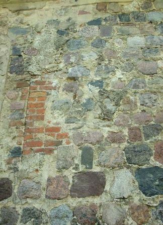 Z pierwotnego detalu zachował się portal zachodni oraz przekształcone 2 portale w elewacji południowej. W ścianach północnej i południowej zachowały się także ślady pierwotnych okien, słabo czytelne z uwagi na przemurowania. (fot. czerwiec 2013)