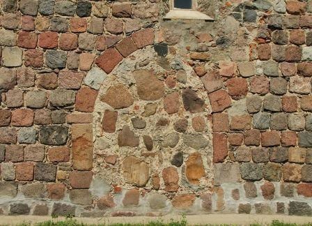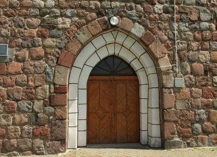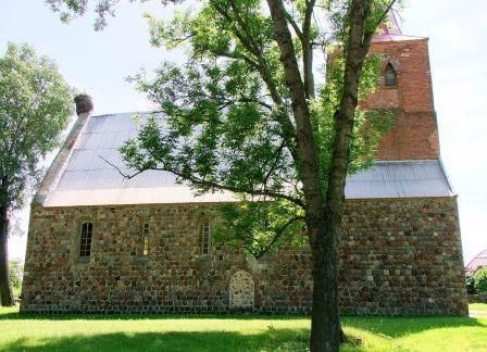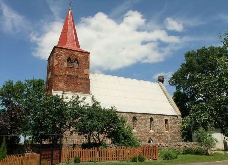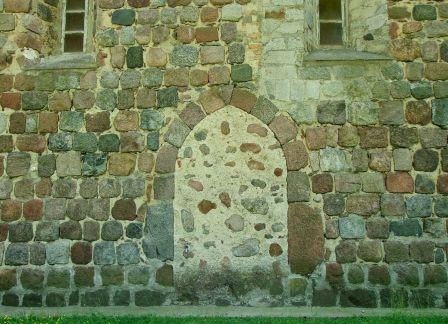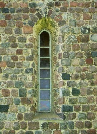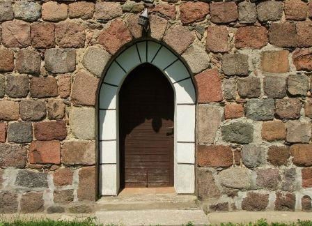 Z pierwotnego detalu zachowały się niemal wszystkie okna zamknięte łukiem półokrągłym, w tym triada okien w ścianie wschodniej oraz 4 ostrołukowe portale - zachodni, dwa południowe i północny. Jeden portal południowy i portal północny są obecnie zamurowane. W narożniku południowo-wschodnim (czwarty głaz ponad cokołem) oraz w południowym portalu po lewej zewnętrznej stronie (drugi głaz od dołu) znajdują się kwadry z szachownicami, przy czym w miarę czytelna jest jedynie szachownica na kwadrze portalowej. Kościół oczywiście był zamknięty. (fot. czerwiec 2013)