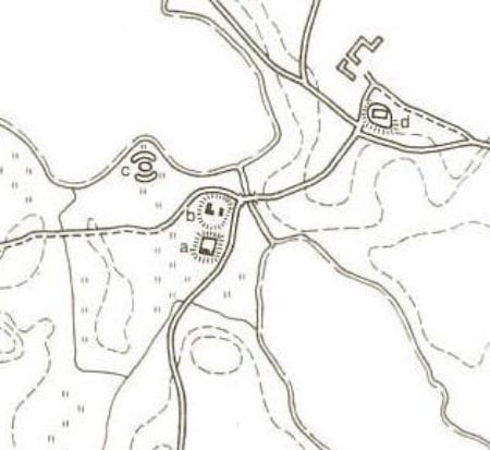 lokalizacja grodziska:a-zamek, b-podzamcze, c-grodzisko, d-kościół