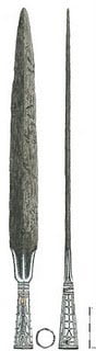 Wyjątkowym pod względem formy, ornamentyki oraz stanu zachowania, znaleziskiem jest bogato inkrustowany grot włóczni (odkryty wcześniej, w trakcie rekonesansu w 2002 roku). Jak opisuje W. Chudziak: „ostrze jest długie, stosunkowo smukłe, w kształcie wydłużonego, na końcach zaokrąglonego deltoidu z lekko zaznaczoną granią. Wyraźnie oddziela się ono wklęsłym wcięciem od nieregularnie sześciobocznej w przekroju tulei, która posiada dwa otwory do nitów mocujących drzewiec, zachowany szczątkowo na jej dnie. Tuleja zwęża się od wylotu do nasady ostrza”. Grot z Nętna zachowany jest w stanie bardzo dobrym - sprzyjające warunki na dnie jeziora, sprawiły, że większym zniszczeniom nie uległa żelazna baza. Dzięki temu, w tak dobrym stanie dotrwały donaszych czasów zdobienia, wykonane z trzech metali kolorowych - złota, srebra oraz miedzi. Największa destrukcja