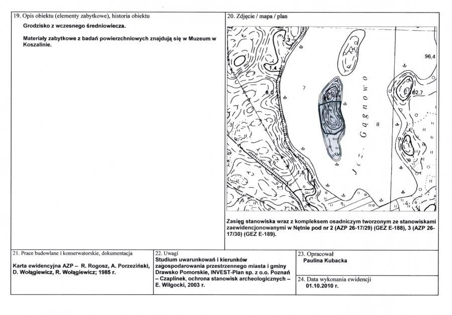 We wsi znajduje się grodzisko wczesnośredniowieczne. Nr. stanowiska 1, obszar AZP 9-23. Położone jest na wyspie jeziora Gęgnowskiego