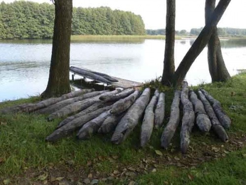 W celu potwierdzenia tych informacji, w 2003 roku rozpoczęto systematyczne penetracje podwodne w promieniu kilkudziesięciu metrów od wyspy. Na równoległe skupiska pali dębowych natrafiono w południowo-zachodnim rejonie jeziora, w najwęższym miejscu pomiędzy linią brzegową wyspy i lądu.Wiązki pali miały średnicę od 15 do 20 cm. Z tego rejonu wydobyto ponadto elementy związane z poziomą konstrukcją mostu (np. dranice stanowiące część jezdną, o szacowanej szerokości około 2,6 m). Wszystkie elementy z nawodnej części mostu nosiły ślady nadpalenia - co sugeruje, że cały obiekt mógł ulec zniszczeniu w skutek pożaru. Jednak skupiska pali wokół poszczególnych wiązek filarów pozwalają również stwierdzić, że konstrukcja była wielokrotnie naprawiana lub odbudowywana.