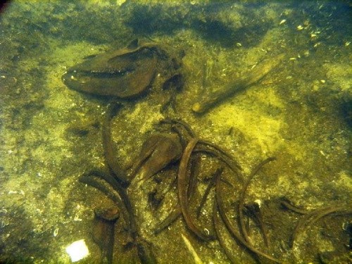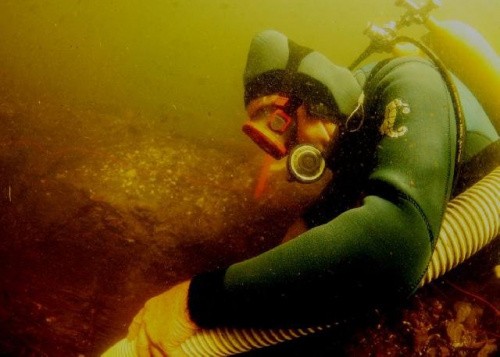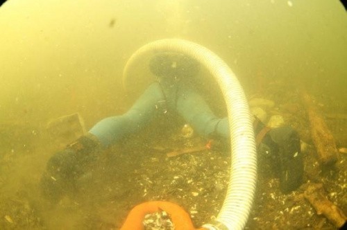 Wykopaliska archeologiczne na dnie. Tylko w takiej pozycji można eżektorem wysysać muł z dna odkrywając znaleziska