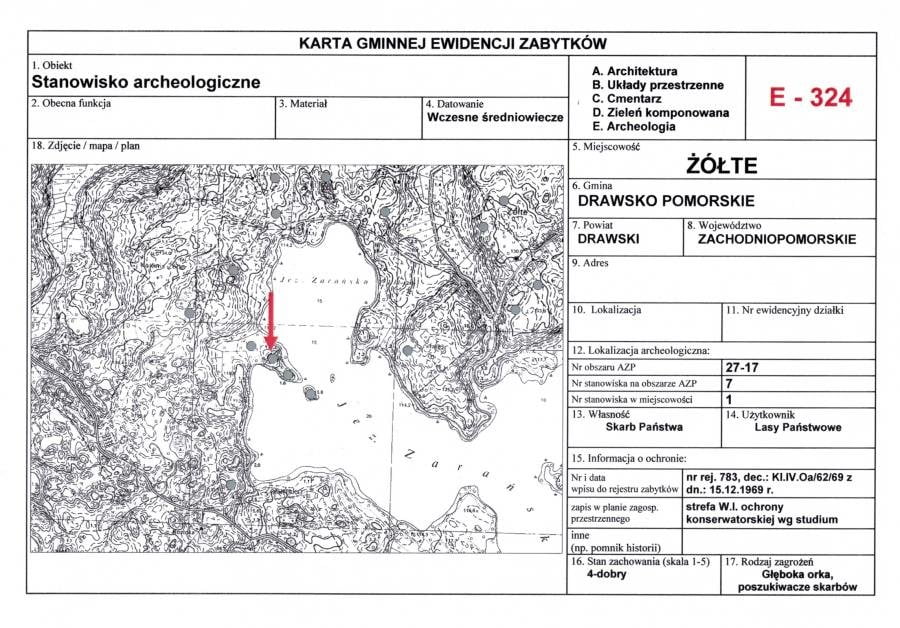 Według nowych interpretacji jest zbliżone charakterem i funkcją do ośrodka z Tissø. To kompleks osadniczy nad Jeziorem Zarańskim - stanowisko Żółte.W skład kompleksu osadniczego wchodzą: grodzisko nizinne ulokowane u podstawy półwyspu (o wymiarach 60x50 m i wysokości 7,5 m nad poziom lustra wody), położona dalej osada podgrodowa oraz kolejna, zlokalizowana na zachód od wałów grodziska. Być może cypel odcinał pierwotnie od lądu wąski pas wody, obecnie teren podmokły. Kompleks badany był przez kilka sezonów archeologicznych - prace prowadzono zarówno na ziemi, jak i podwodą. Zwłaszcza te ostatnie przyniosły nadzwyczajne rezultaty. Objęto nimi cały akwen wokół półwyspu i położonej w pobliżu niewielkiej wyspy. Na relikty spodziewanych konstrukcji drewnianych natrafiono tylko wokół wyspy. Wystąpiły one w formie setek pali dębowych o średnicy 10-25 cm, nabitych pionowo, w nieregularnych odstępach. W tej chwili, ze względu na wahanie poziomu wody stale zagrożone są destrukcją. W trakcie penetracji podwodnej z użyciem wykrywacza metali odkryto szereg zabytków wydzielonych: grot broni drzewcowej, dwanaście żeleźców toporów, wędzidło, liczne przedmioty drewniane (m.in. wieszaki, pięknie zdobione naczynia i łyżki, wrzeciona etc.), metalowe (noże, odważniki, waga), ozdoby (kabłączki, pierścionki, okucia pasa,) przęśliki, całe naczynia oraz fragmenty ceramiki. Dodatkowo natrafiono na spoczywające na dnie jeziora szkielety końskie.