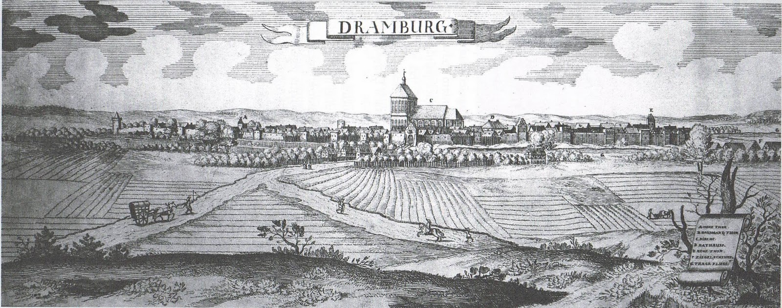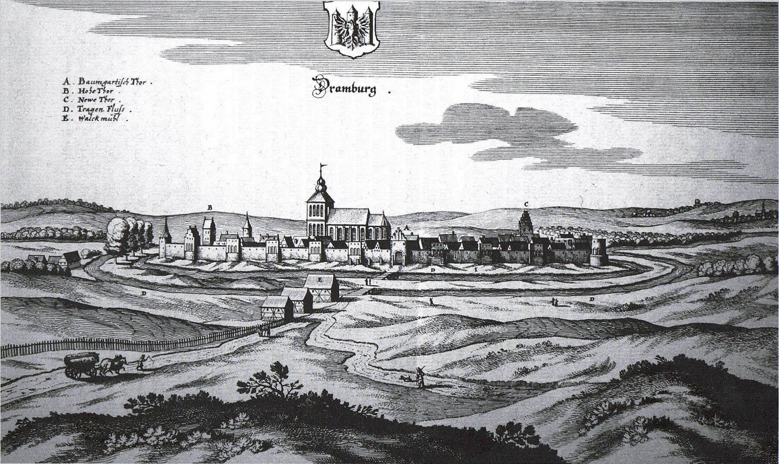 W moich zbiorach mam taki widok Drawska przypisywany Merianowi, jego pracowni, bo raczej nie mógł on sam zrobić kilku tysięcy miedziorytów i drzeworytów.