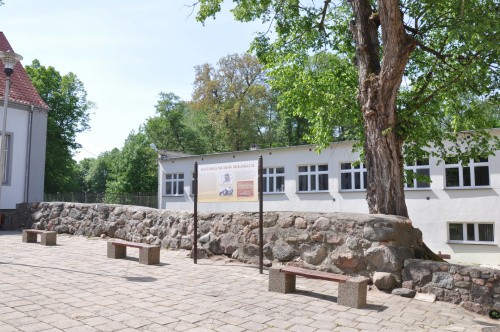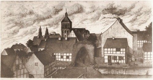 rycina z 1842 z widokiem Drawska od strony południowej z kościołem oraz pozostałością średniowiecznej bramy miejskiej zwanej Niską (niem. Niederer Tor) lub Gudowską (niem. Baumgartener Tor) z przylegającymi do niej budynkami. (źr: http://dramburg.blogspot.com)