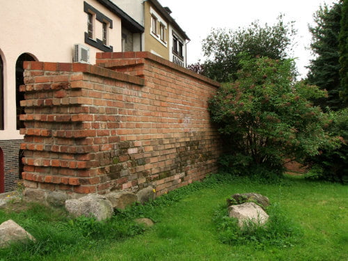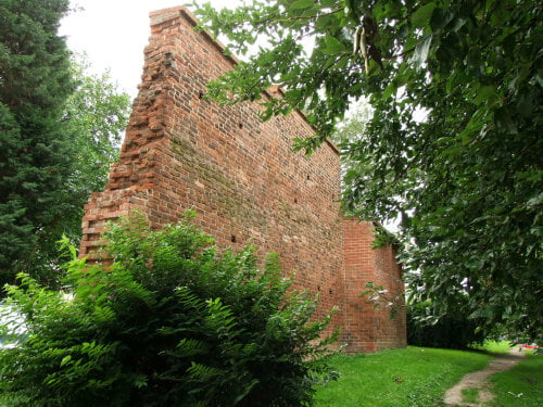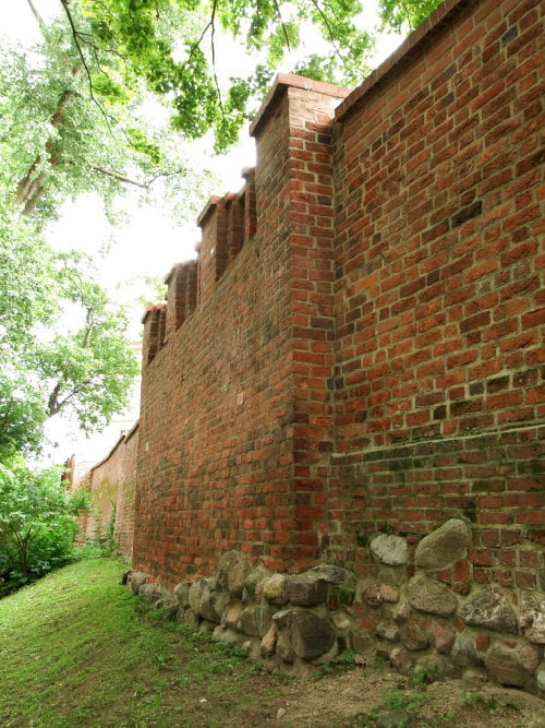 8. Do tego fragmentu przylega długi, miejscami obrośnięty chaszczami lub rusztowaniami odcinek muru. Warto zwrócić uwagę na wendyjski układ cegieł sugerujący jeszcze XIII-wieczną metrykę. Tytułem przykładu