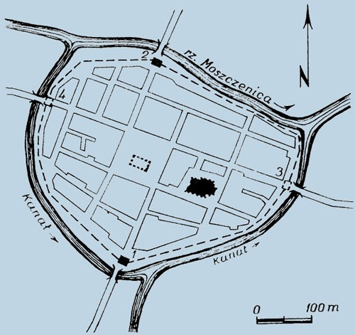1-Brama Koszalińska, 2-Brama Słupska, 3-Brama Łąkowa, 4-furta polna.