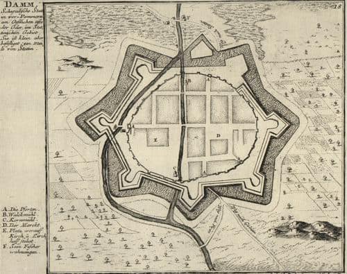 plan nowożytnych obwarowań z końca XVII wieku wewnątrz których widać plan średniowiecznych murów