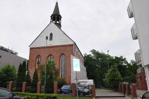 Wstęp możliwy po otwarciu sobie bramki, nikt się nie czepia. Drzwi do kaplicy były już jednak zamknięte. Od wschodu gotycki portal, a zanim krzaki, psie kupy i miejscowi menele konsumujący "wisienkę". (fot. sierpień 2012)