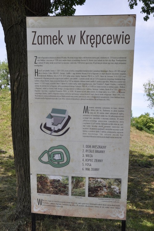 Zamek powstał na kopcu ziemnym w dolinie Iny i był przedmiotem badań terenowych. Pierwotna, może drewniano-ziemna fortalicja powstać musiała po 1310 roku, a przed 1338 rokiem rokiem gdy została zniszczona przez wojska księcia szczecińskiego Barnima III. Kolejna faza przekształceń zamku nastąpiła zdaniem Z.Radackiego w połowie XIV wieku. Nowy zamek na planie kwadratu o boku około 30m zabezpieczała fosa i i zewnętrzny wał. Otaczał go mur ceglany postawiony na kamiennym cokole. od północnego wschodu do obwodu przylegał dom mieszkalny o nieznanej szerokości, zamknięty od strony dziedzińca ścianą szkieletową. W narożniku północno-zachodnim umieszczono czworoboczną wieżę o wymiarach 8,5x9m. Zachowała się jedynie jej dolna część do wysokości około 4m stąd trudno określić pierwotne zwieńczenie i wysokość. Od południa sąsiadował z nią silnie wysunięty ryzalit bramy o szerokości około 7m, może otwarty od strony dziedzińca, położony naprzeciwko domu mieszkalnego. Zamek w Krępcewie począł podupadać w XV wieku i około 1500 roku był już opuszczony. W późniejszym okresie mury uległy destrukcji bądź zostały celowo rozebrane, jednak w stopniu nie zacierającym rozplanowania założenia.