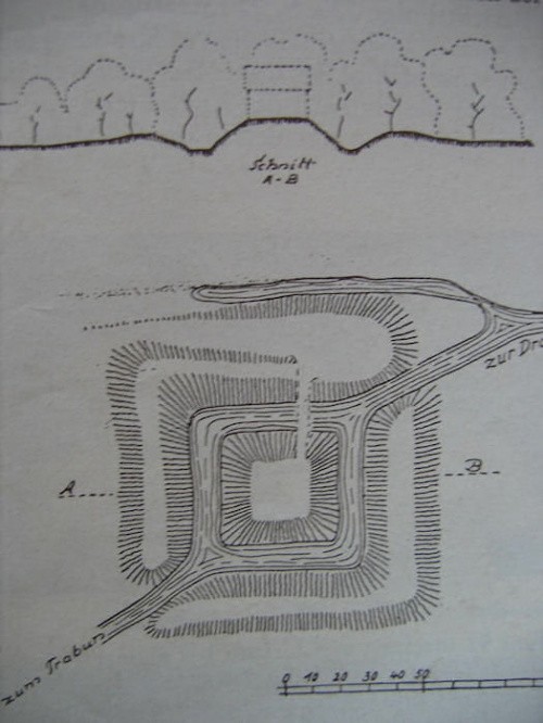 Heimatgruß – Rundbrief Nr 221 ( str 37 ) zacytował fragment pracy z końca XIX w autorstwa H. von Wedel., w której autor podał , że na „Alter Burgwall” znajdowały się ślady budowli a „niewielkie wzgórze jest wyjątkowo dobrze zachowane i wykorzystywane było do polowań”. Stwierdził, że „od północnej strony znajduje się jeszcze dobrze zachowane wejście na most i do zamku …” Wydaje się ,że wejście na zamek było od strony zachodniej, jednak możliwe ,ze zachowane dziś przyczółki na fosie są z czasów owych polowań.