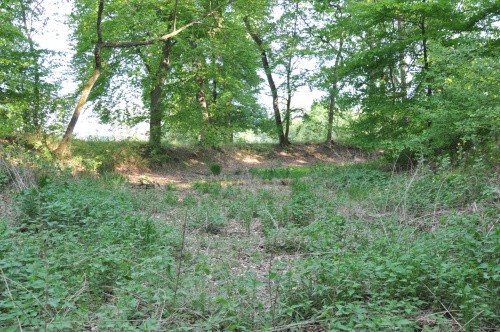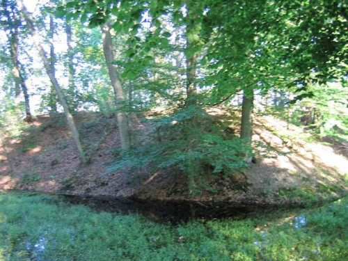 …Przypadkowa leśna boczna droga okazała się właściwym wyborem. W pewnym momencie droga ta skończyła się. Było już po godz. 18.00 z zachodu poprzez drzewa, głównie dęby, przebijały się promienie słoneczne. Z lewej strony widoczna była wspaniale oświetlona wolno zachodzącym słońcem wieś Prostynia. Wtem, gdy wzrok oswoił się z leśnym półmrokiem , wśród drzew, z prawej strony, zarysowywało się coraz wyraźniejsze o regularnych kształtach, porośnięte liściasto – iglastym drzewostanem wzgórze. Odczuwało się ,że tu przebiega jakaś mistyczna granica. Z lewej współczesność, z prawej średniowiecze. Niesamowity widok nadała pełna zielonej wody fosa. Nie było wątpliwości ,że jest to dzieło rąk ludzkich. Panująca wokół cisza i duchota potęgowały wyobraźnię. Lecz tętentu koni i okrzyków załogi nie było słychać.