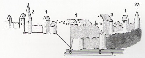odrys fragmentu murów z zabudowaniami zamkowymi: 1-baszty łupinowe, 2-basteje muru nowożytnego, 2a-"belweder", 3-główny budynek zamku z bastejowym ryzalitem, 4-inne budynki zamkowe, 5-basteja w zachodnim narożniku zamku, 6-basteja w południowym narożniku zamku, 7-staw zamkowy