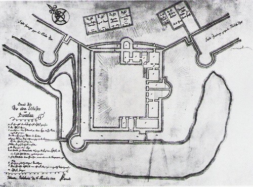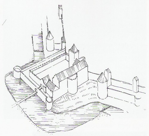 hipotetyczna rekonstrukcja zamku przed 1642 rokiem na podstawie planu N.Bernarda i rysunku Wernera wg. T.Dudziak, A.Kwaśniewski
