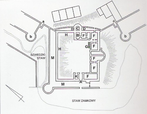 plan P.Rajskiego wykonany na podstawie rysunku Bernarda: A-dawne wejście do zamku, B-wieża zamkowa, C-miejsce starej bastei, D-międzymurze do obrony mostu, F-piwnice w większej części zawalone, G-schody na górną kondygnację, H-ganek na murze obwodowym, K-sklepienia dobrze zachowane, M-zamkowe międzymurze, E-otwory przez które można wejść do starego zamku, I-układ pokoi, L-kanał, a-baszty łupinowe średniowiecznego muru miejskiego, b-basteje XVI wiecznego muru miejskiego