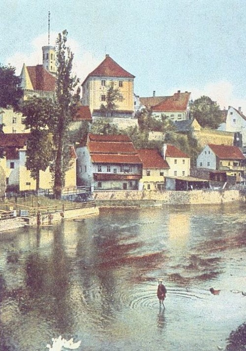 Panorama na miasto od strony rzeki. Wieża wyraźnie góruje nad okolicą