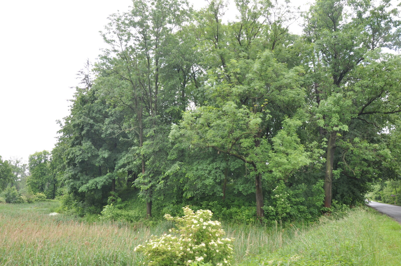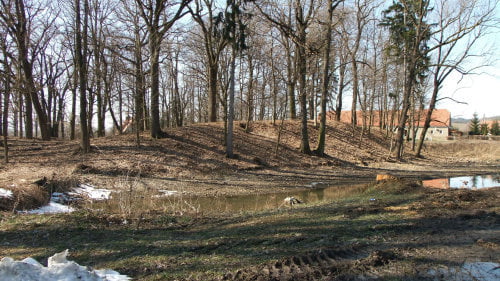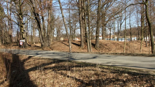 Widok z drogi. Za nią, po lewej niewidoczne w kadrze bajoro będące reliktem fosy.