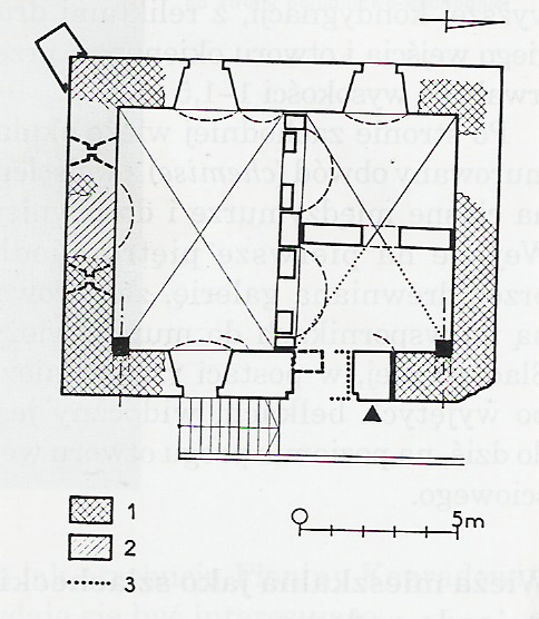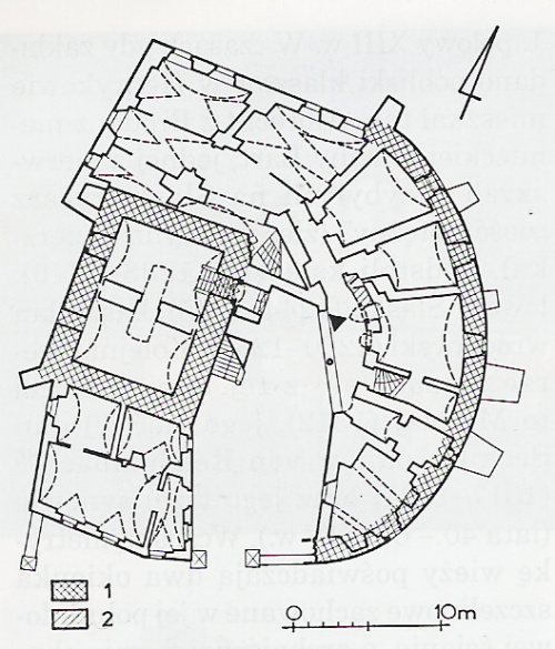 plan przyziemia wg B.Guerquina 1957, 1-mur z XIV wieku, 2-mur sprzed połowy XVI wieku