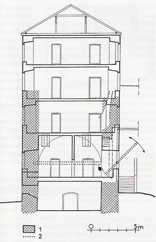 przekrój przez wieżę wg.M.Chorowskiej, 1-mur z XIV wieku, 2-rekonstrukcja