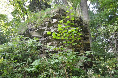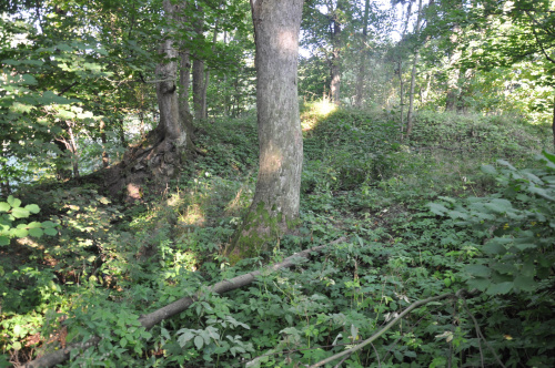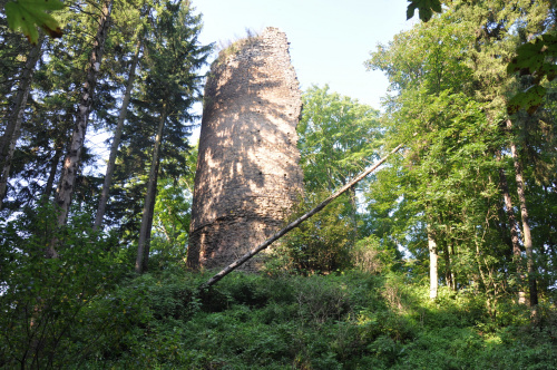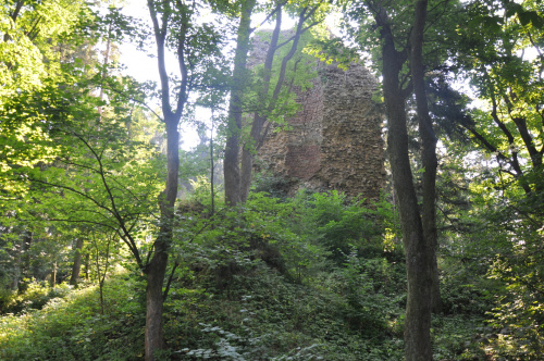 Czy wiosna, czy lato wieżę z najciekawszej strony zasłaniają 2 wiecznie zielone choinki. Sądząc po ściętych na kopcu drzewach była tam ostatnio prowadzona mniej lub bardziej przemyślana akcja przetrzebiania drzewostanu, ale i tak zamku generalnie to nie widać. Uważać trzeba na fosę, która rozlewa się wokół kopca i jej pokonanie może być problematyczne oraz na tubylców, którzy nie życzą sobie parkowania samochodów na ich trawie. fot. marzec 2011