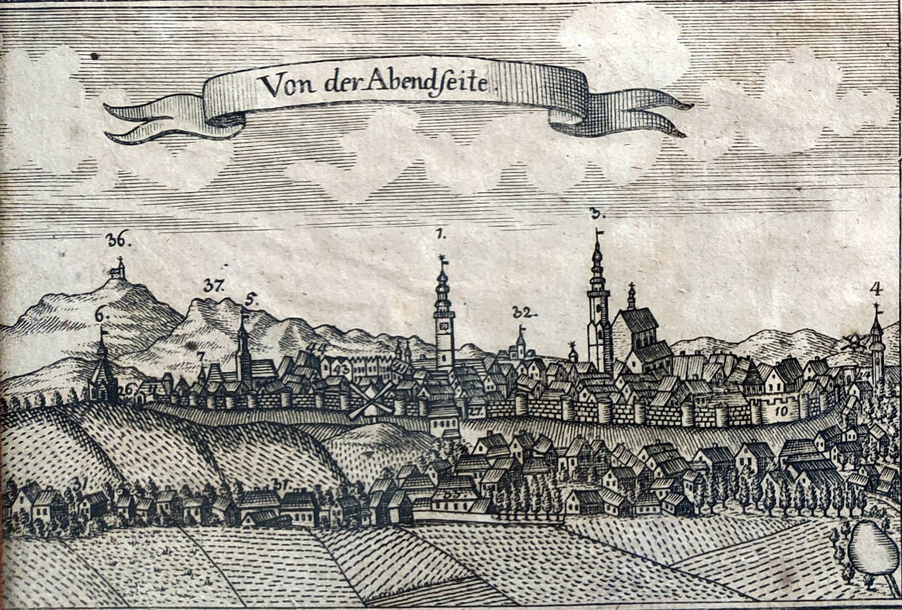DZIERŻONIÓW, panorama miasta od zach., fragment miedziorytu A. Sadebecka z 1790 r. (zbiory Piotra Siemki); pozostałości zamku Hummel oznaczone nr 10